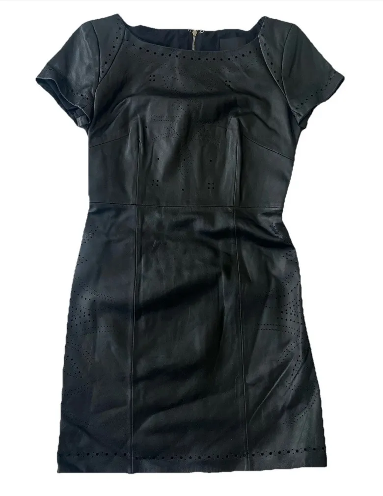 Aryn K Women’s Sheath Dress S Laser Cut Genuine Leather Edgy Holiday NYE Party Excellent Pre-Owned Condition- No holes, stains, or rips (see photos for details) Size: Women's Small (See photos for measurements) - Genuine leather / Lining- Polyester - Lined dress - Laser cut leather dress - Short sleeve mini dress - Zipper closure - Style Profiles: statement dress, goth, luxury, real leather, sleek, structured, holiday party dress, NYE dress, club wear, clubbing dress, going out dress, cocktail dress, LBD little black dress Fast shipping- we ship out the next business day! Offers welcome! We are happy to answer your questions!