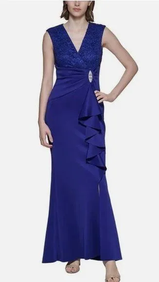 Preowned Jessica Howard Women's Lace Bodice Ruffled Gown Blue Used once Size 12 Make it a memora... Show more