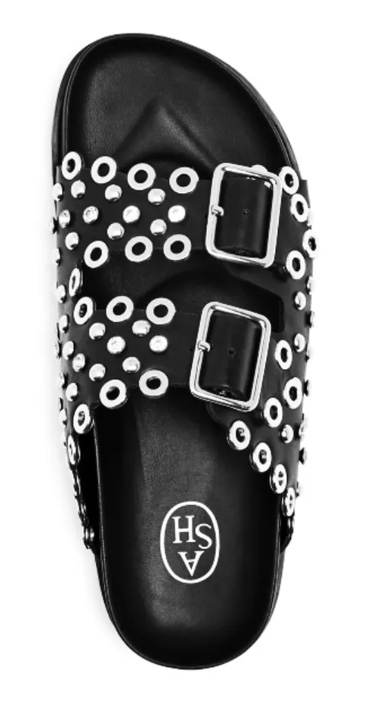NO OFFERS. PRICE IS FIRM AND NON-NEGOTIABLE. NO FREE SHIPPING. Ash "Universe Slide Sandal," size EUR 37 (US 7, according to Ash's size chart). Sold out everywhere! Gently used, with only light signs of wear. Missing stud in an inconspicuous location (see close-up photo); not noticeable when worn. First 5 photos are stock, and the rest (with my pink watermark) are of the actual item. Real, quality leather. Super comfortable, like all Ash shoes! Rated 5/5 stars online and no longer available in stores. Bloomingdale's description: "Functional buckled straps for a flexible fit. Contoured footbed. Open toe. Slip on. 1" platform. Leather upper and lining, rubber sole."