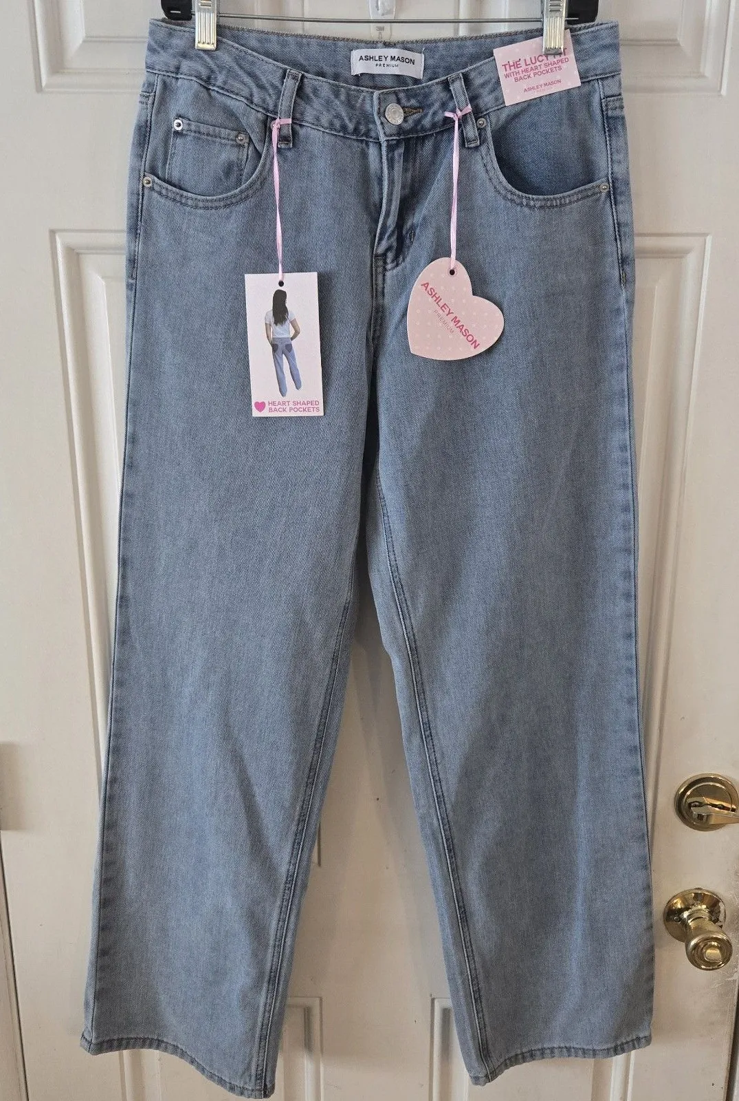 Ashley Mason Premium Lucy Fit jeans featuring adorable heart-shaped back pockets and a light wash denim finish. These are straight-leg jeans with a flattering mid-rise silhouette and a soft cotton blend feel. Perfect for Y2K-inspired, coquette, girly, and pop-retro aesthetics. New with tags and never worn, making them a great statement denim piece. Easy to style with baby tees, cropped cardigans, or platform shoes. Approximate measurements flat lay Inseam 32" Rise 9.5" Waist 30"