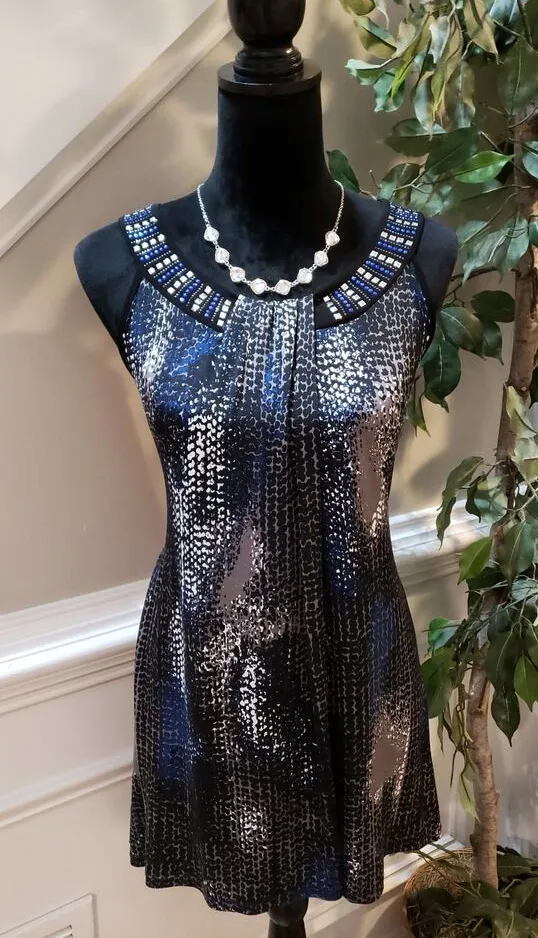 Brand: Ashley Stewart Type: Top Color: Blue/Black This stunning sleeveless top by Ashley Stewart features a bold animal print design in blue and black with metallic silver accents. The top is adorned with beautiful beaded detailing along the neckline for a touch of sparkle. Perfect for a night out or special occasion, this top comes in size 18/20 and offers a flattering pleated style for added dimension. A great addition to your wardrobe!