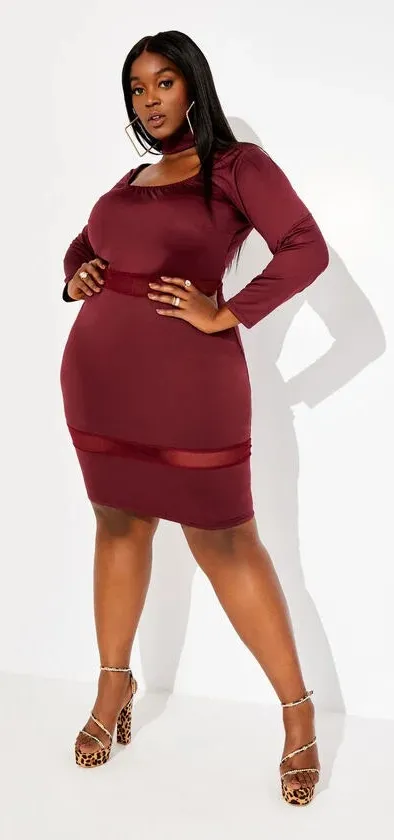 Ashley Stewart Womens Dress Size 1X Curvy Girl The Hayley Wine Sexy Mesh NEW GENERALLY SHIP SAME OR NEXT DAY FROM FLORIDA!!! New with tags. Stretch knit bodycon dress with mesh panels throughout, mock neckline, cutout bust, long sleeves and keyhole at back featuring button closures at nape. Almost 41.5" long 21" underarm to underarm 18" across at bottom of mesh waist panel 21" across at hips Polyester/Spandex Style D3604CG