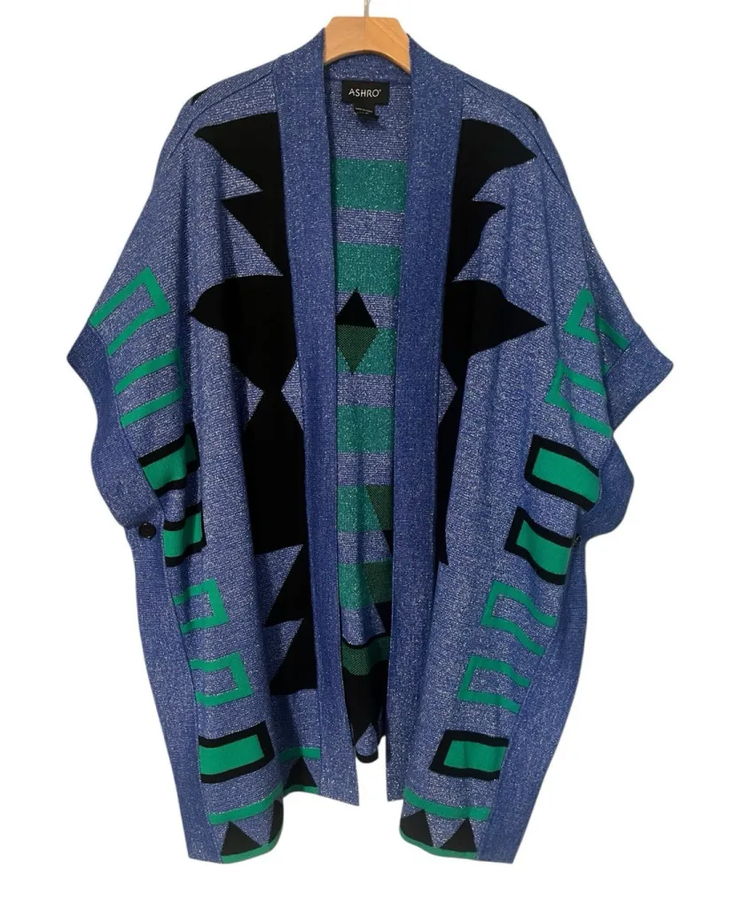 In brand new in bag with tags condition. There are no issues or flaws. Top of shoulder to bottom hem measurement is approximately 35 inches. Side to side measurement is approximately 38.5 inches. The ASHRO Open Shawl Poncho Cardigan Sweater in XL size is a stylish and colorful addition to any wardrobe. Made from a blend of metallic and acrylic materials with a tight-knit fabric, this geometric patterned sweater is perfect for various occasions such as travel, parties, casual outings, or workwear. The relaxed fit of the cardigan, featuring button accents and an open design, allows for easy styling and comfort. The multicolor design in shades of blue, green, and black adds a trendy touch, making it a versatile piece for the winter, fall, and spring seasons. Item9502