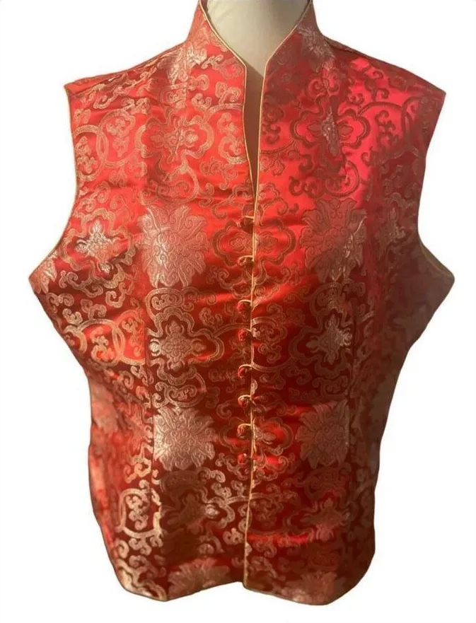 Absolutely Stunning Piece! This Red and Gold Vintage Chinese Vest has 8 Toggle Closures in Front, in Pristine Condition, Gold Floral-like Designs Through Out with Gold Piping along front, Collar, and Shoulder Openings. Neckline Goes Up Sides With Pleats/Pegs on Both Sides of garment Making this a Womens Vest. Rare to find this in an XXLARGE! Perfect for Chinese New Year Red symbolizes Good Luck in Chinese customs. Vintage Excellent condition Sleeveless 100% Silk Approximate measurements: 25in armpit to armpit 26in length Bin #3