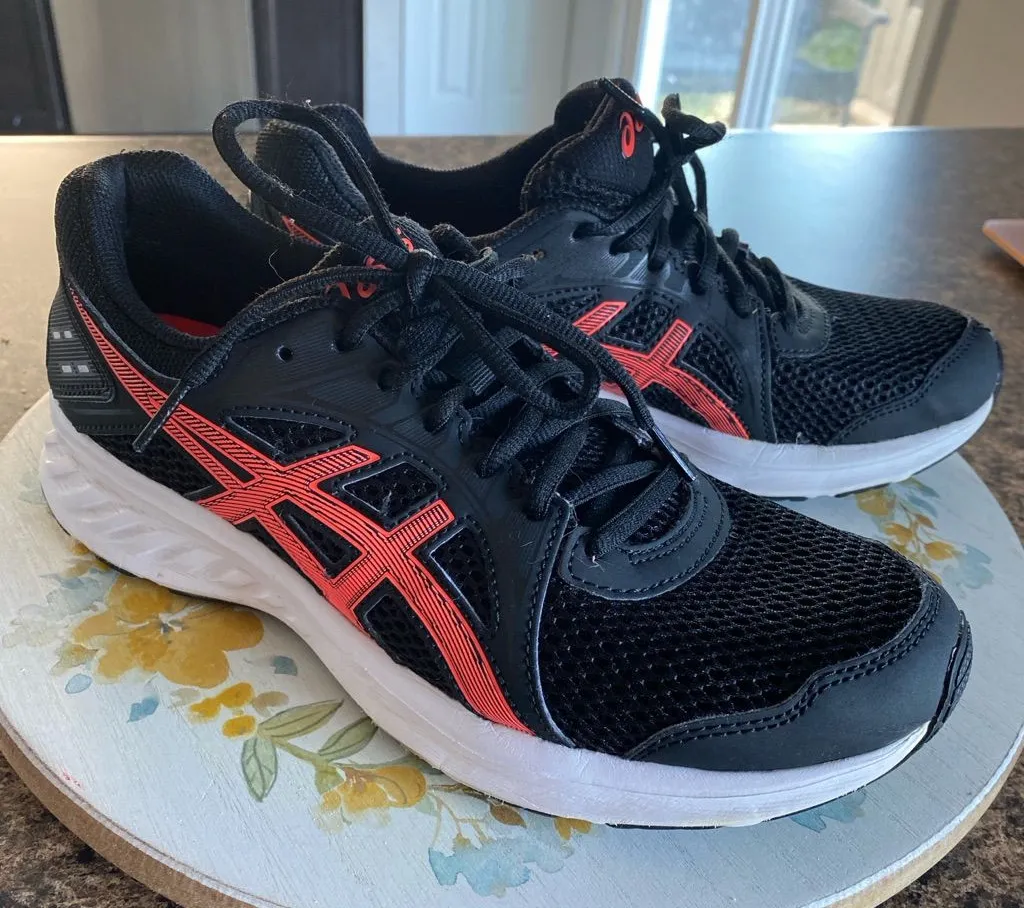 Sleek ASICS sneakers with a black mesh upper and red accents. Ideal for sports and casual outings.