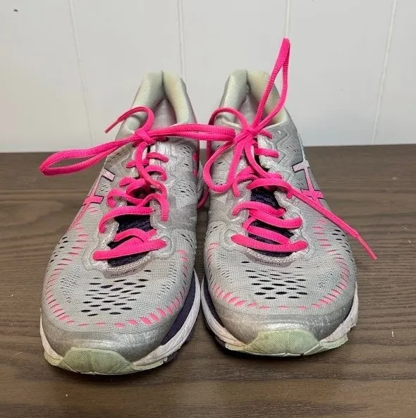 ASICS Gel Kayano women's running shoes in silver and pink. These lightweight athletic sneakers offer... Show more