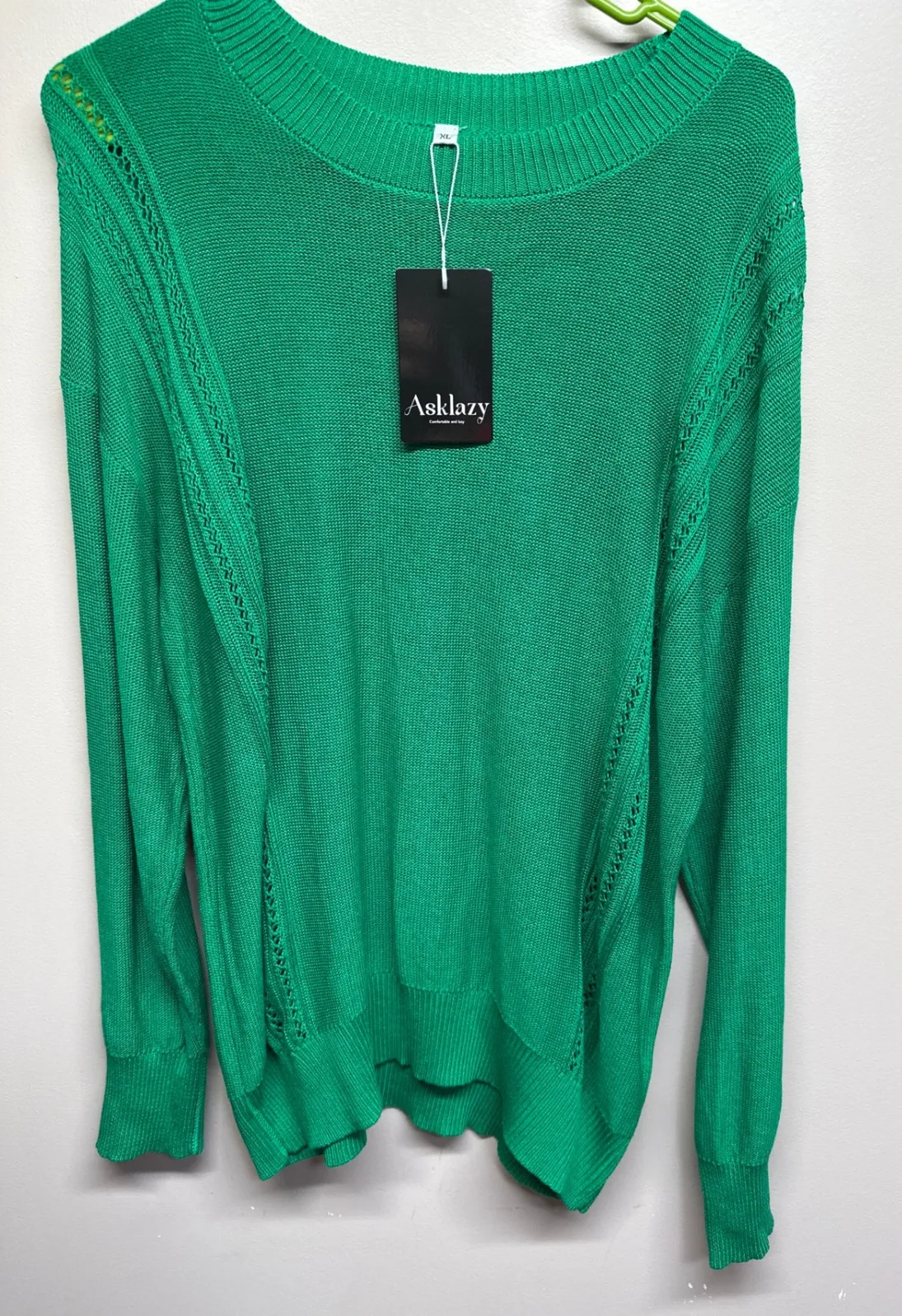 Asklazy green knit crew neck sweater with eyelet detail on sleeves and sides. This stylish sweater offers a relaxed fit and is perfect for layering during transitional weather. Its unique eyelet accents add a touch of subtle detail. Ideal for a casual day out or a relaxed evening. Style: Pullover Department: Women Material: 100% Viscose Neckline: Round Neck Sleeve Length: Long Sleeve Type: Sweater Features: Lightweight, Sheer Pattern: Solid Fabric Type: Knit Accents: Crochet Knit Style: Open-Knit Season: Spring, Summer Fit: Relaxed Occasion: Casual Garment Care: Machine Washable Keywords: green sweater, knitwear, eyelet detail, crew neck, long sleeve, women's fashion, casual wear, lightweight sweater, basic knit, everyday style, comfortable, stylish