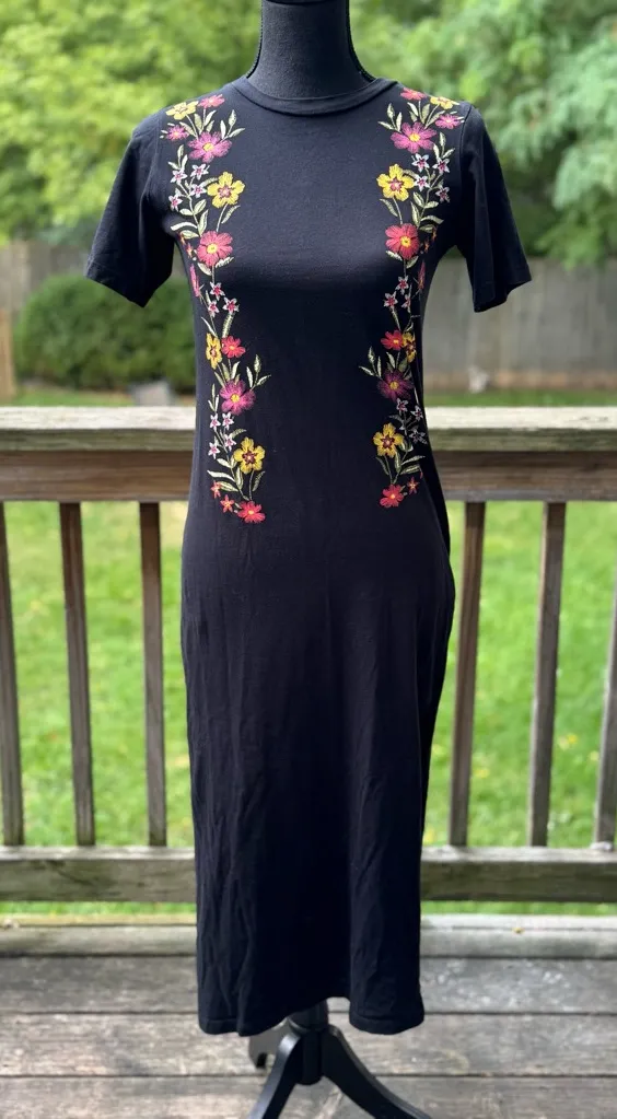 Chic black midi dress. Features vibrant floral embroidery print. Ideal for versatile styling. Split... Show more