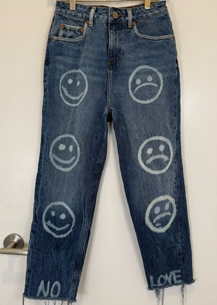 Dark blue jeans with playful emoticon graphics. Features frayed ankle hem. Unique and trendy style.... Show more
