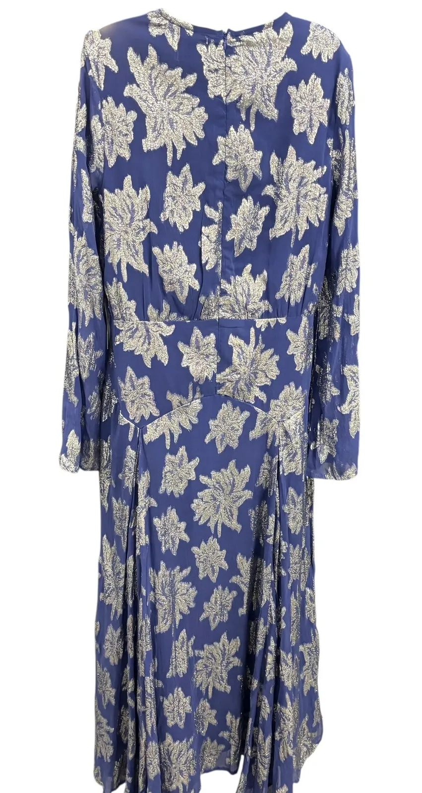 Elegant long-sleeve maxi dress featuring a striking blue base adorned with a shimmering floral patte... Show more