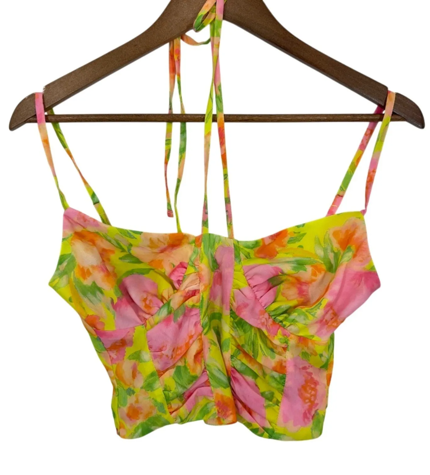NWT in Excellent Condition Approximate Measurements: Length: 16" Pit-Pit: 15" Waist Flat Lay: 14" Radiate vibrant energy in this ASOS Design floral crop top. The eye-catching neon yellow base bursts with a playful watercolor floral print in shades of hot pink and lush green, creating a bold and beautiful statement. Designed with a flattering halter neckline and alluring ruched detailing across the bust, this top accentuates your figure with a touch of flirty charm. Delicate spaghetti straps add a feminine touch, while adjustable ties ensure a perfect custom fit. The open back design with crisscross ties adds an extra element of allure. Ideal for a summer music festival, a tropical vacation, or a fun night out with friends.