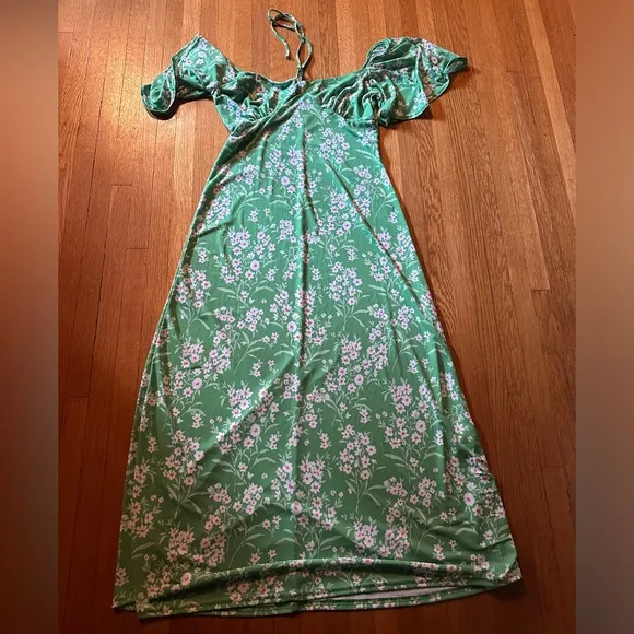 ASOS DESIGN flutter sleeve midi tea dress with tie detail in green floral, Size 6 Stretchy material... Show more