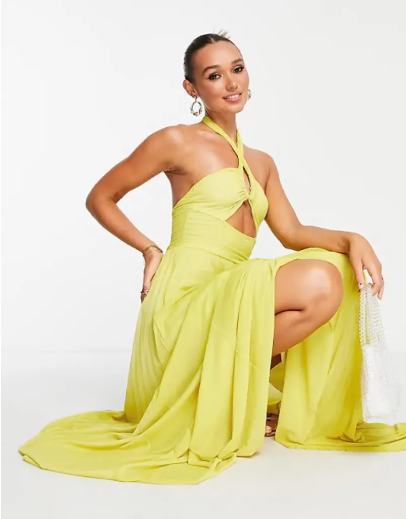 ASOS Design Lime Yellow Halter Channelled Pleated Mesh Maxi Gown Dress Size 10 Brand: ASOS Design... Show more
