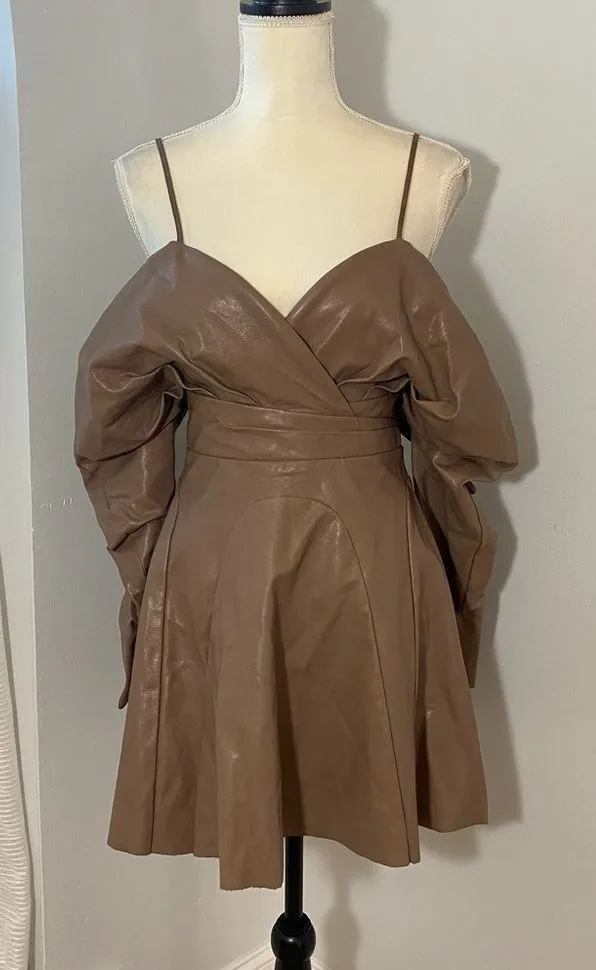Cold-shoulder design V-neck Adjustable cami straps Puff sleeves Pleated skirt Zip-back fastening Min... Show more