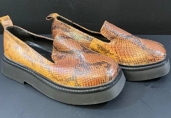 Features 1.5 inch chunky heel with a squared style toe, slip-on type, and snake print design all around. Made of textile and rubber material. Excellent and pre-owned: worn only once. This item has been cleaned, sanitized and deodorized. Features: • Shoes/Loafers Size: Womens 6 Condition: Pre-Owned Good