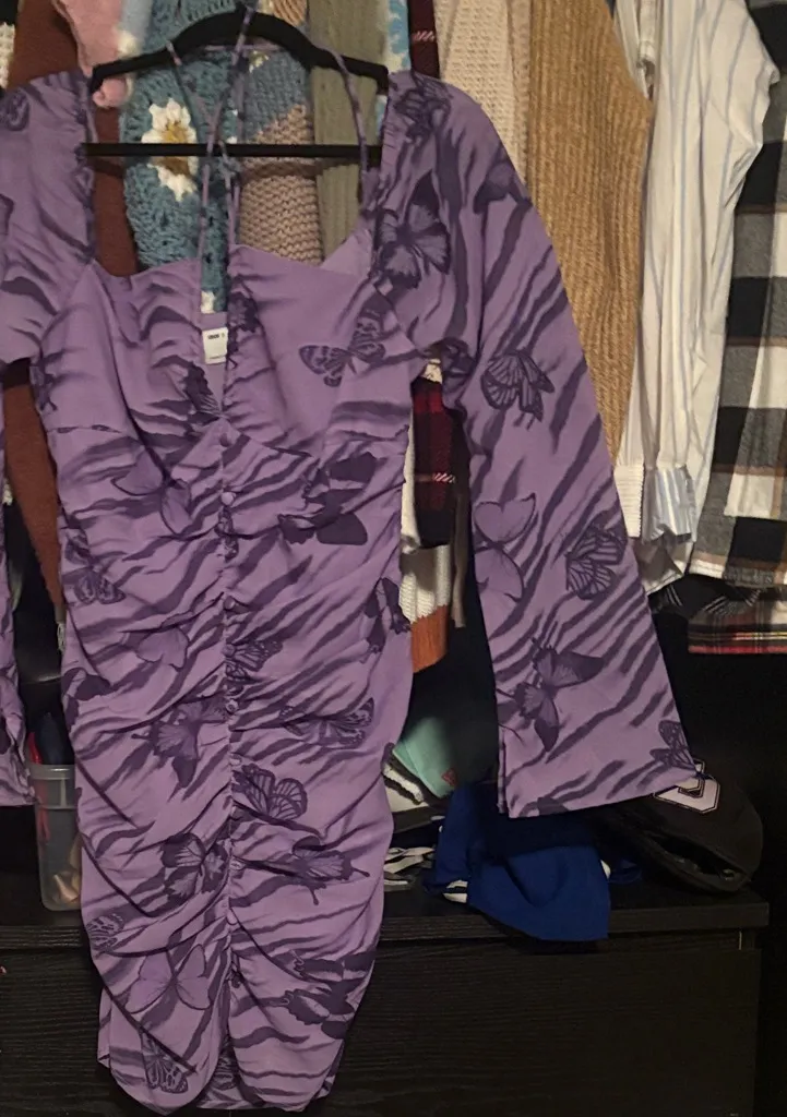 Elegant purple dress with a butterfly design. Perfect for a party or dance.