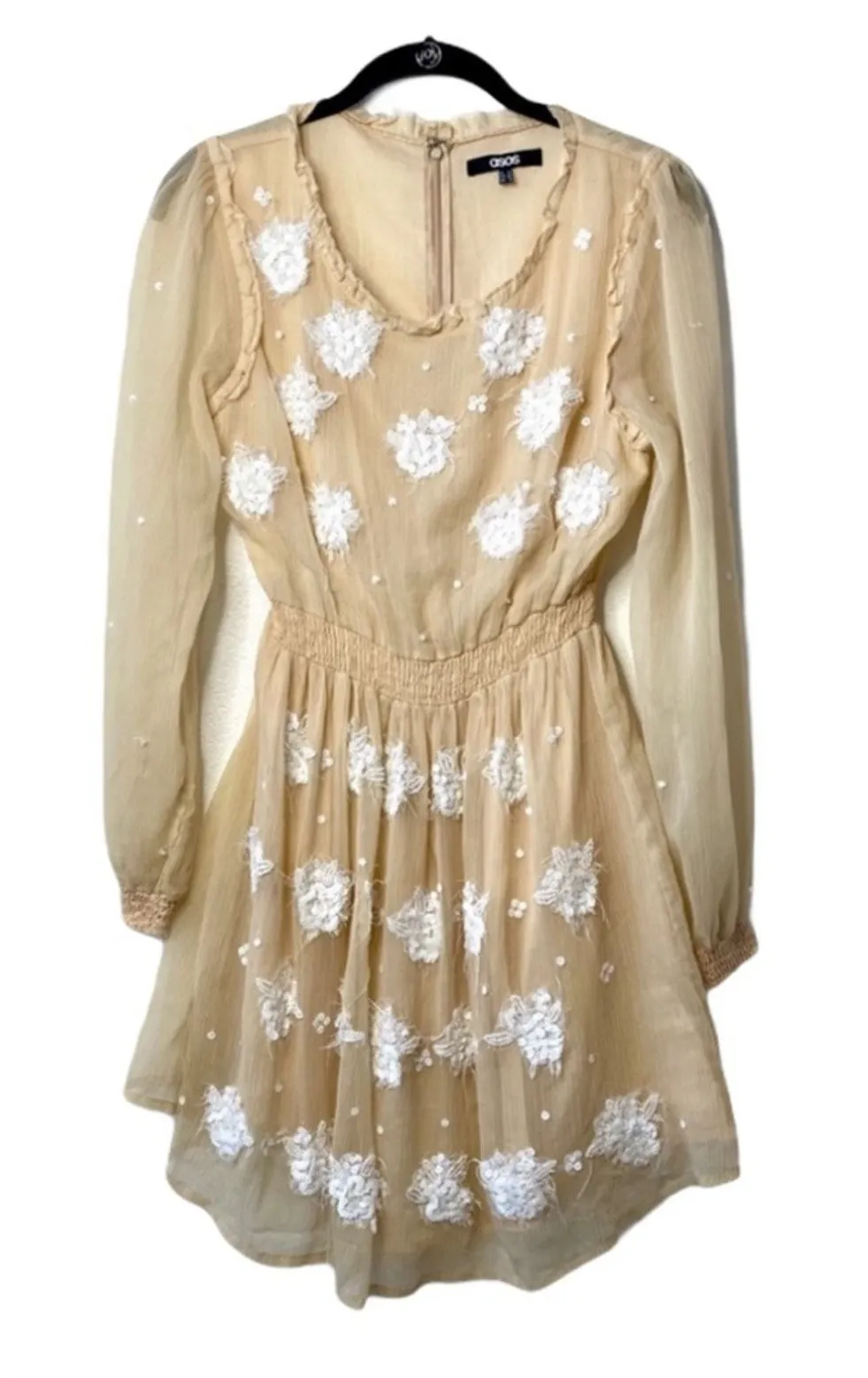 Beautiful nude dress with white sequin flower accents across the front. Sheer sleeves. Dress is line... Show more
