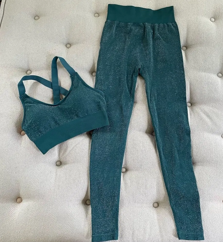 ASOS South Beach Green Seamless leggings and cross back padded sports bra with silver shimmer thread... Show more