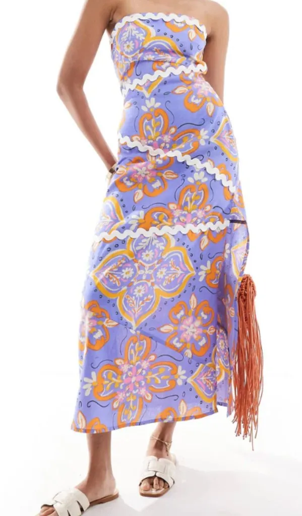 ASOS Tile Printed Strapless Dress in the color Purple. Strapless neckline, midi length, high side sl... Show more