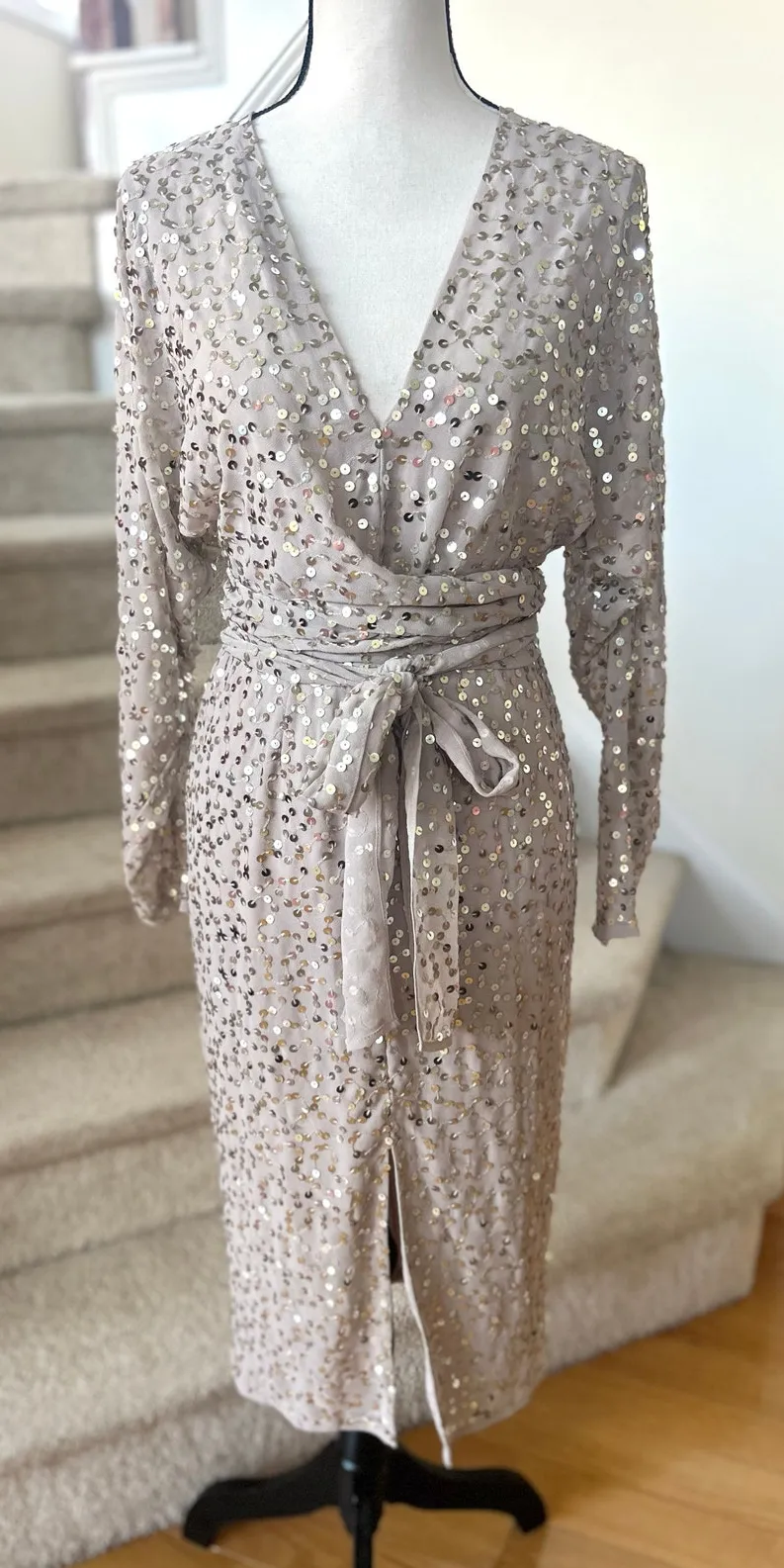 Excellent condition. Taupe grey beige, v-neck, wrap around tie at waist. Long sleeve midi length she... Show more
