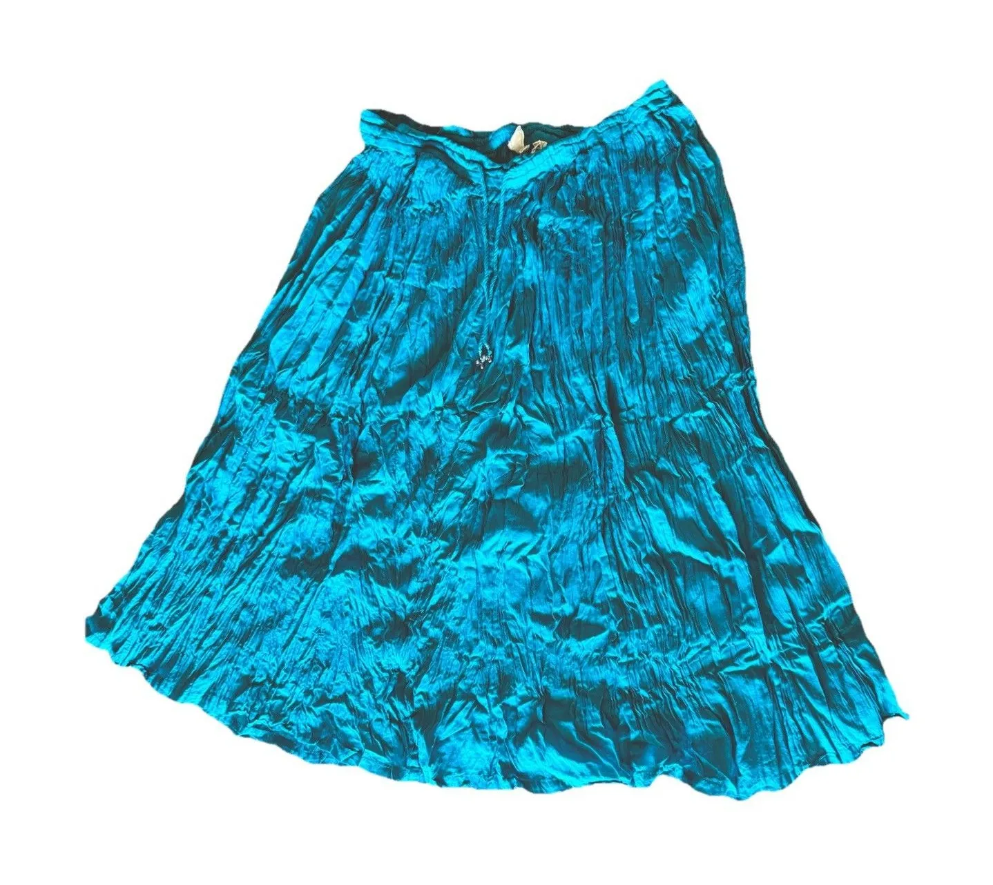 Beautiful Aspira womens crinkle boho skirt in a vibrant turquoise tone. Size Medium. 100% cotton. Made in India. Features an elastic waistband, lightweight flowy fabric, and a classic bohemian gypsy style. This skirt features small decorative bell accents at the end of the waist ties, adding a charming boho touch and a soft jingling sound when you move.