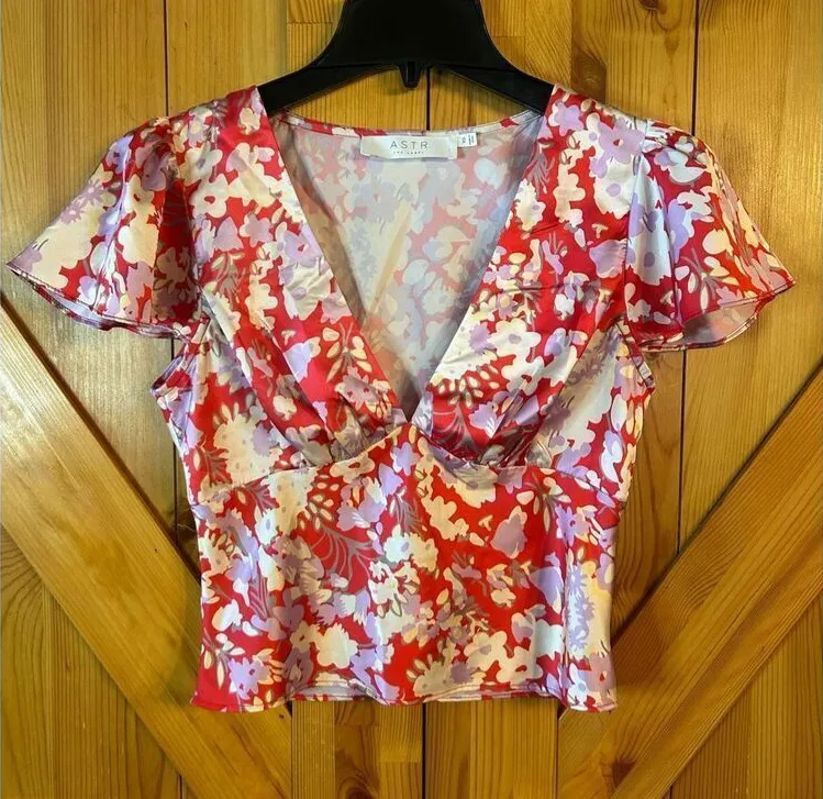 Astr blouse size XS red lilac, floral, short sleeve side zipper crop there is a small snag mark on t... Show more