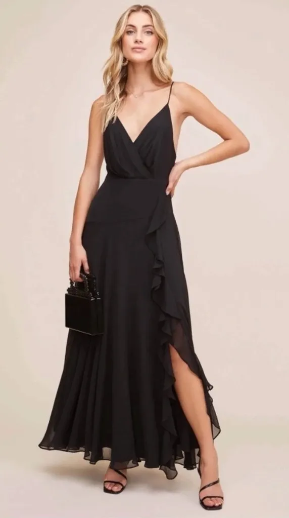 Excellent Preowned Condition Color: Black Surplice neck Adjustable straps Slit at bottom hem Ruffle... Show more