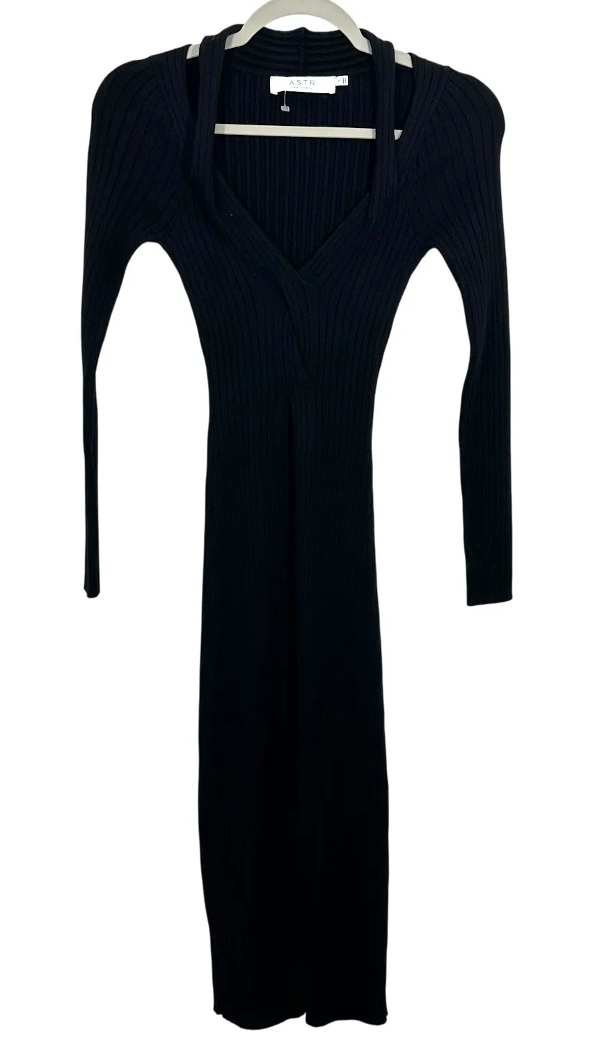 Pre-Owned in Great Condition *Lots of Stretch* Approximate Measurements: Length: 48" Pit-Pit: 14" Sculpt your silhouette in this stunning ASTR The Label black ribbed knit midi dress. The deep V-neckline and figure-hugging fit create an undeniably chic and sophisticated look, while the long sleeves offer elegant coverage. A daring side slit adds a touch of modern allure, perfect for transitioning from day to night. Elevate your wardrobe for cocktail parties, date nights, or an upscale evening out.