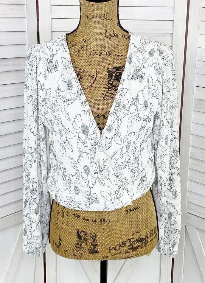 ASTR the Label Floral Pleated Satin Faux Wrap Blouse Top Size Small Bright white with black flora... Show more
