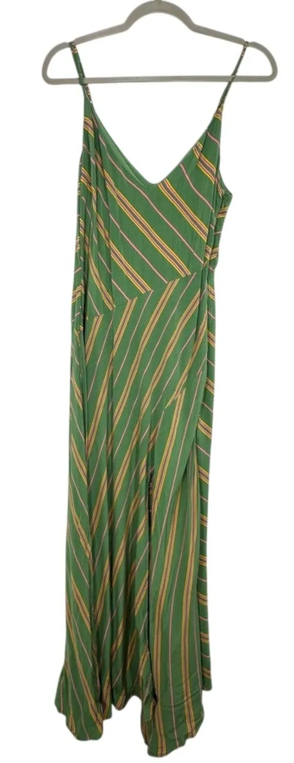 Pre-Owned in great Condition Retro Muted Green Orange Gold Approximate Measurements: Length: 55" Pit-Pit: 16" Waist: 13" Flow into your day with this vibrant ASTR the Label midi dress. The eye-catching vertical stripe pattern in shades of green, yellow, and pink creates a playful yet chic look, while the V-neckline and spaghetti straps offer a flattering silhouette. A convenient side slit adds a touch of allure and allows for effortless movement, making it perfect for a summer picnic or a stylish brunch.