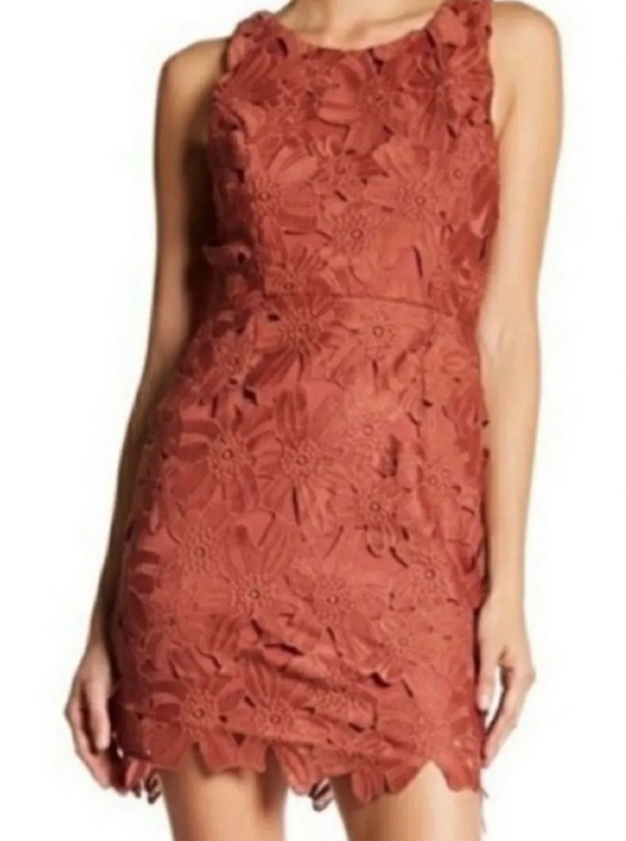 Romantic charm unfolds in this stunning lace dress. A tapestry of intricate floral patterns creates a captivating texture, while the sleeveless design and mini length offer a modern, flirty silhouette. The fitted bodice and defined waistline accentuate your figure, leading to a subtly scalloped hemline that adds a touch of whimsy. A concealed back zipper ensures a seamless fit. Flat Lay Measurements: Pit to pit = 16.5" Waist = 14.5 Length = 33" Style: A-Line, Mini Dress Length: Short Color: Brown, copper, rusty orange Occasion: Party/Cocktail, wedding guest Material: Lace, Polyester, Polyester Blend Character: Flower, Romantic, Party Girl, Cocktail, Date Night Keywords: lace dress, floral dress, mini dress, sleeveless dress, party dress, cocktail dress, occasion dress, red dress, brown dress, women's dress, floral lace, scalloped hem, fitted dress, aline dress
