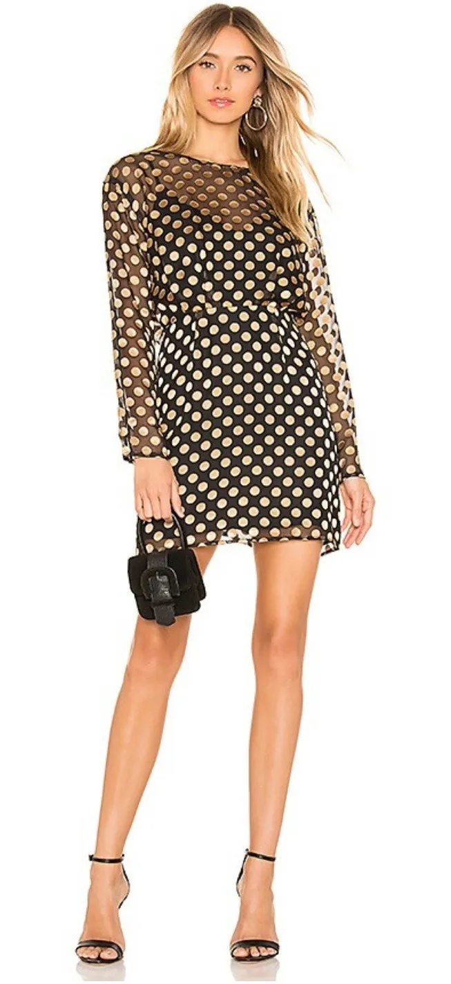 , great condition. Sheer black and gold polka dot fabric over black tank lining, hook and eye closu... Show more
