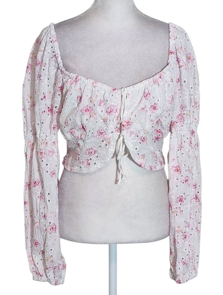 ASTR The Label pink and white floral blouse with eyelet lace detail, smocking, and long fuller sleev... Show more