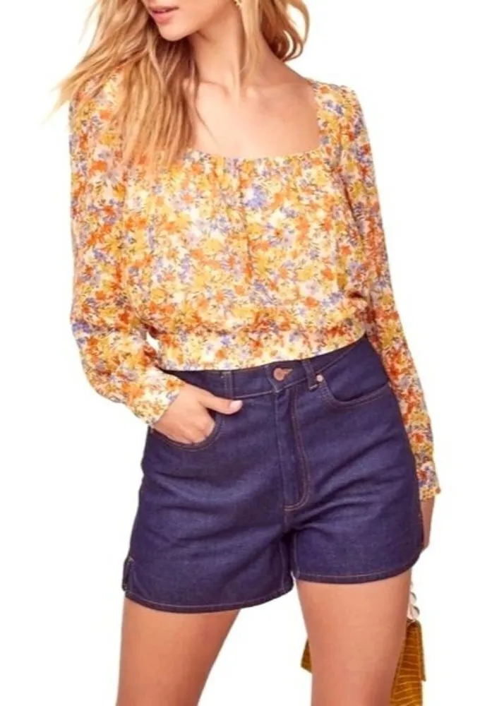 This blouse from ASTR The Label is in excellent condition. It is in an allover multicolor floral print in an orange, tangerine color. It features; a squared neckline, long, puff sleeves with button cuffs, tie-back hem, slightly cropped length and is lined. It is crafted from 100% polyester.