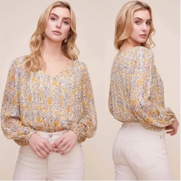 ASTR the Label V-Neck Pleated Long Sleeve Blouse Size M Floral Cream, Blue, and Sunflower Yellow... Show more