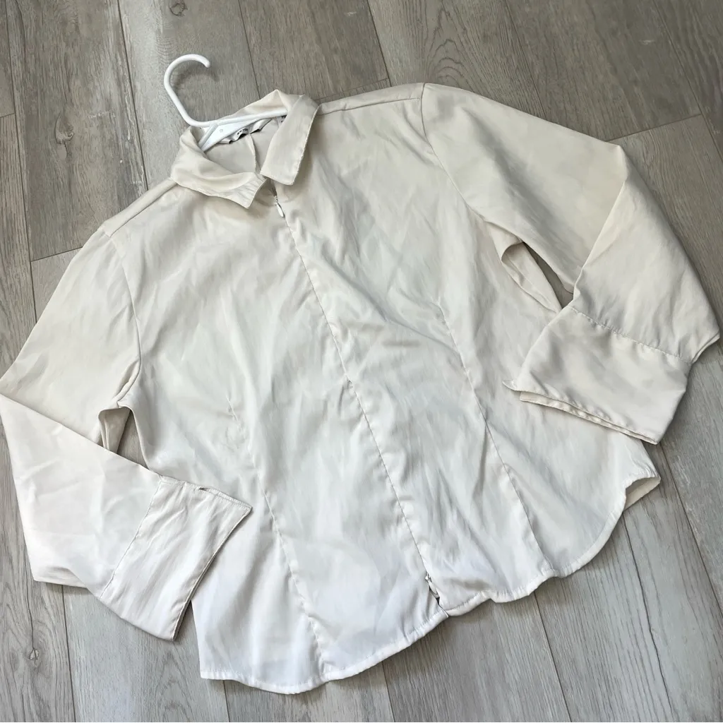 Vintage Sporty Full Zip Jacket in the color Cream. Collared, hidden front full zip closure, long sleeve with splits at sleeve hem. Boxy, slightly cropped silhouette. Lightweight, semi-sheer fabric. Size medium, womens. In pre-loved condition, does have some light scuff/staining at front as shown in photos. Polyester, nylon, spandex. Super cute sporty, vintage, retro, preppy, classic, athleisure, minimalist, all seasons style. Brand is At Last. //C241, 6.4