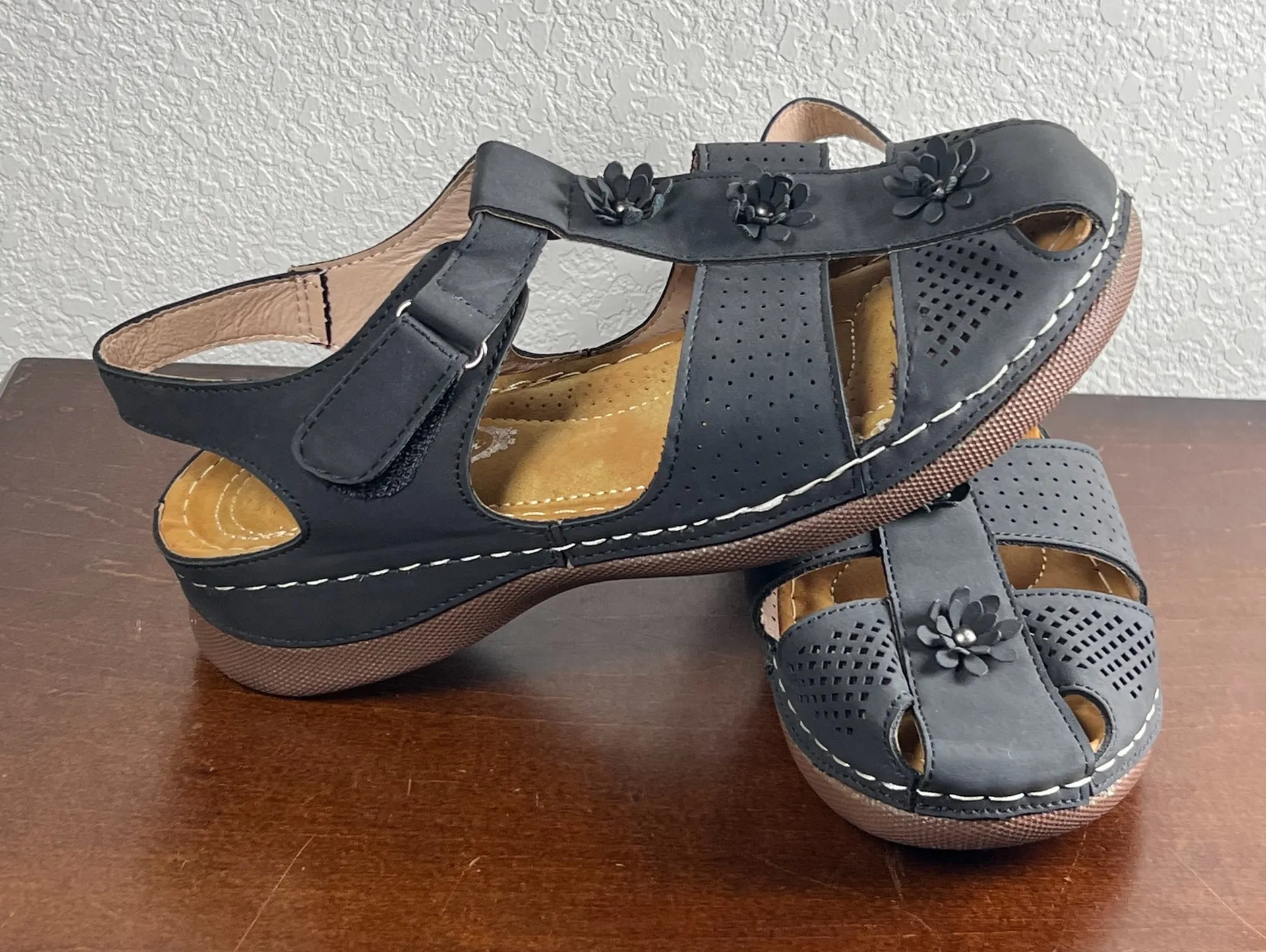 The Atalina Women's Black Floral Bohemian Sandals are a stylish and comfortable option for travel or casual wear. Featuring a slip-on closure and a wedge heel, these sandals offer arch support and a cushioned insole for all-day comfort. The black floral pattern and strappy design add a touch of bohemian flair, while the faux leather lining and synthetic upper material ensure durability. Perfect for women looking for a lightweight, adjustable sandal with a trendy eyelet accent.