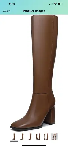 I bought them from Amazon but decided to keep another color. Worn only once to try on. I have the same pair in a different color. They’re true to size and fitted around the calf. Hit perfectly, right below the knee. Stiff heel so you won’t roll your ankle easily. Super comfy to walk in. No scuff marks. Still in box. Reselling. Bought out boots that came faster and no longer need these. Super cute and a dark light brown.
