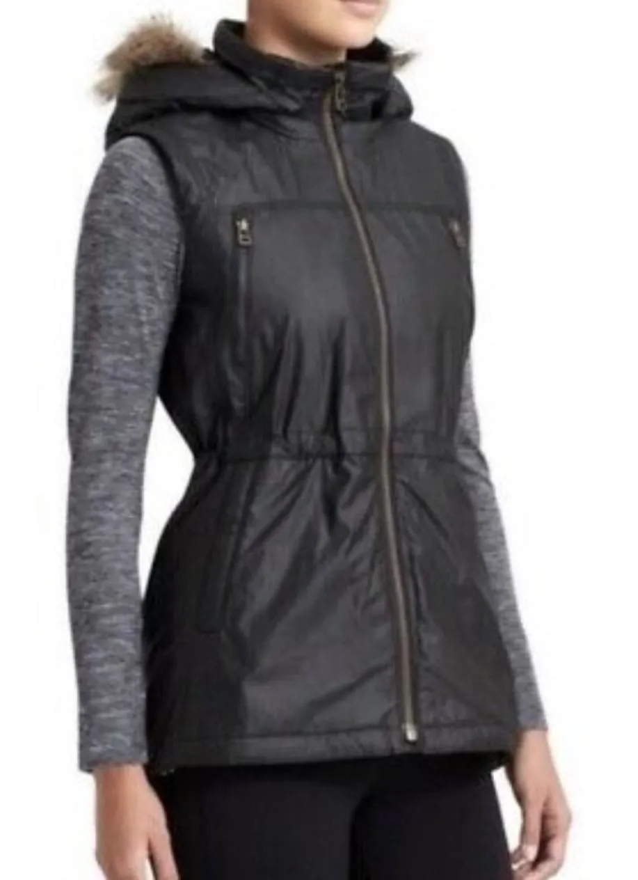 Athleta hooded puffer vest in black with faux fur trim. This vest features a drawstring waist for a... Show more