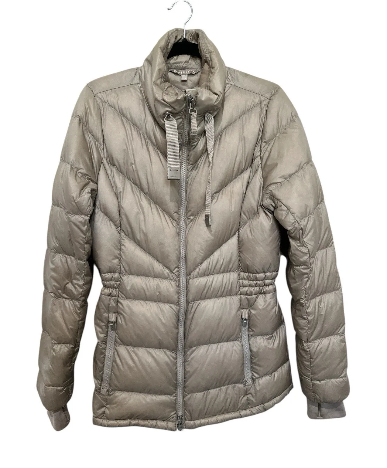 Athleta Banner Peak Down Jacket in a beige or "dove grey" color. This jacket features a full zip, a... Show more