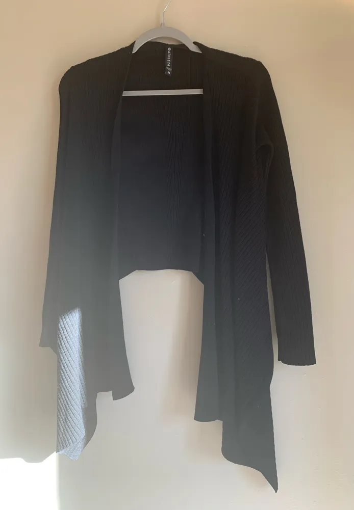 Chic black cardigan by Athleta. Perfect for layering. Soft and versatile.