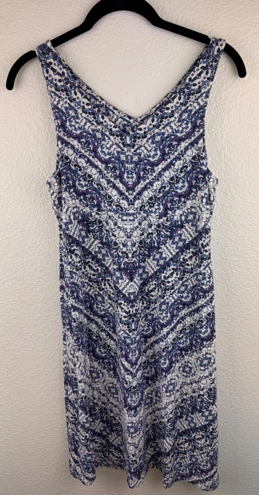 Keywords: Athleta dress, women's dress, XS dress, sleeveless dress, v neck dress, paisley print dress, blue and white dress, micro modal dress, spandex dress, casual dress, travel dress, summer dress, athleta clothing, designer dress, comfortable dress
