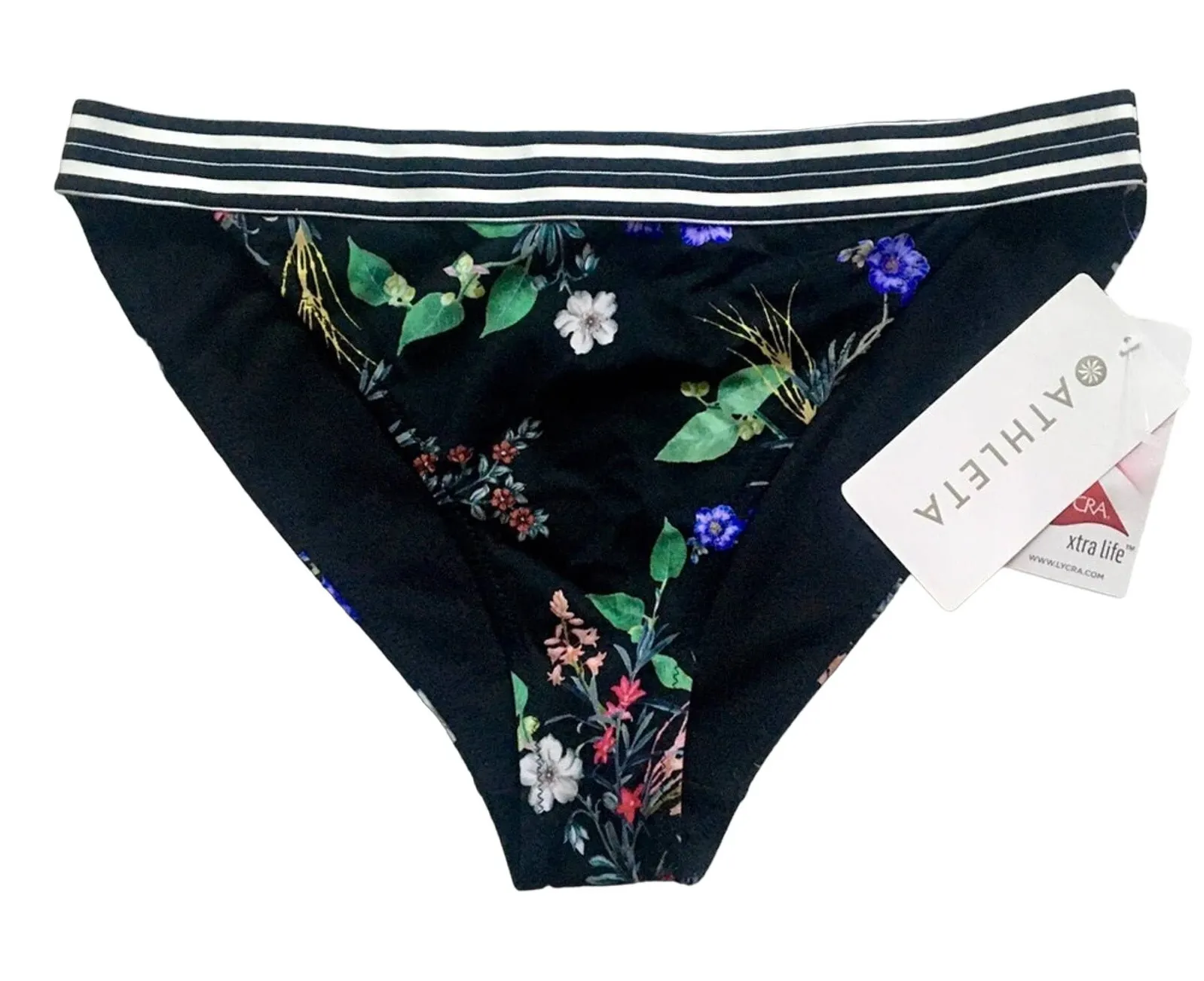 Perfect for sunny days, these Athleta bikini bottoms feature a gorgeous botanical floral print paired with a striped banded waist for a flattering look. The low-rise fit & soft, stretchy fabric make them ideal for vacations, beach trips, and poolside lounging!