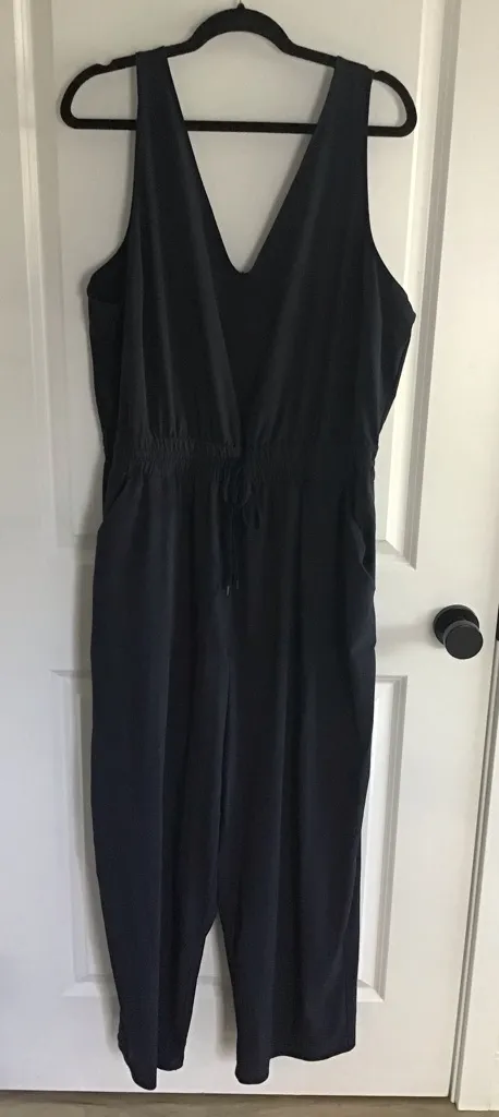 Chic black jumpsuit with a sleeveless design. Features a drawstring waist for a tailored fit. Ideal... Show more