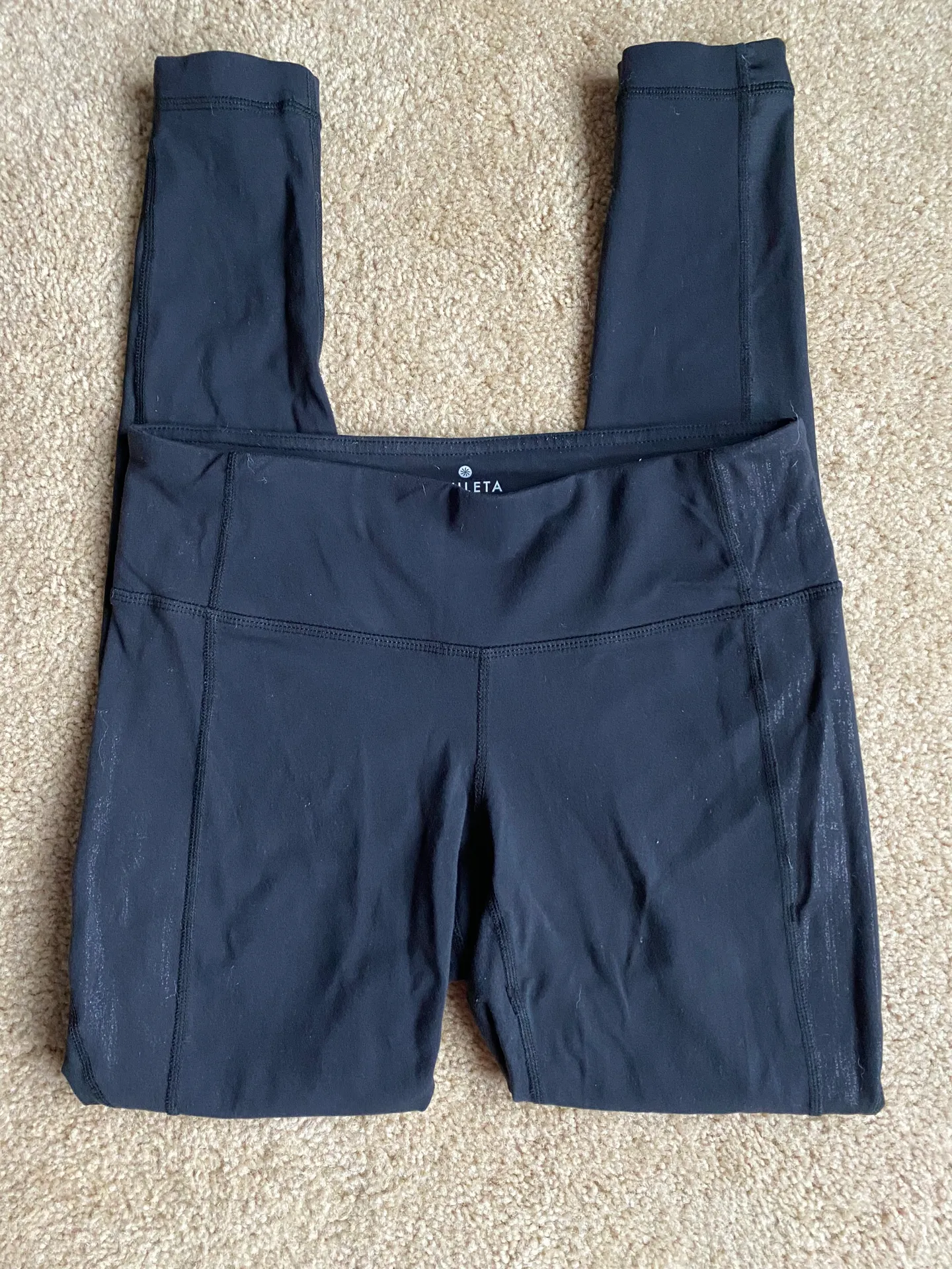Size small, Full length, black leggings with shiny detail on sides. No wear, no stains, rips, or tea... Show more