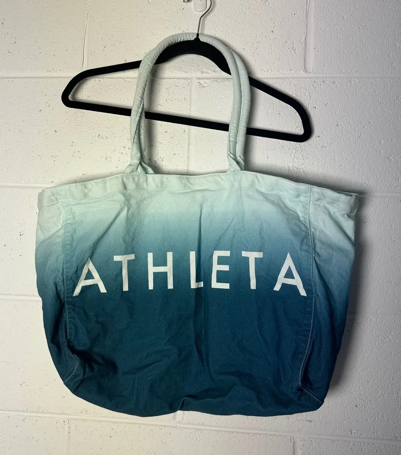 Athleta ombre tote bag in teal and blue hues. This spacious canvas tote features the Athleta logo pr... Show more