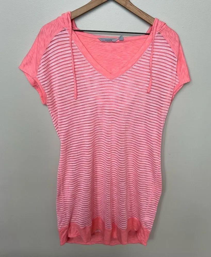 Athleta Pink Cotton Hooded Short Sleeve Swim Cover Up Striped Lightweight Cotton Poly Blend Size... Show more