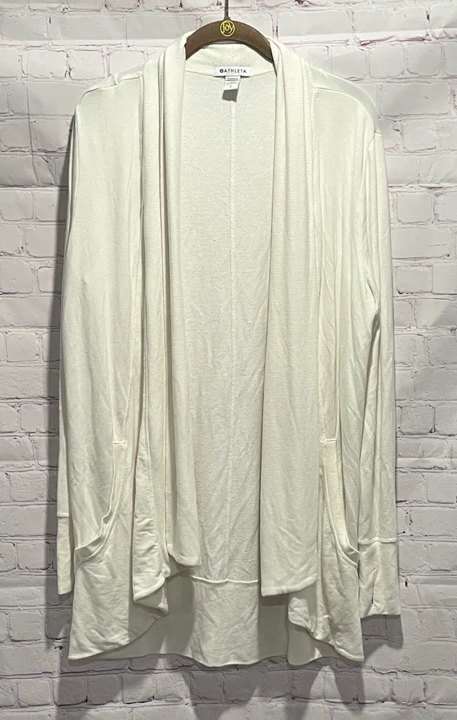Elegant cream cardigan. Open front design. Soft and comfortable fabric. Perfect for layering.