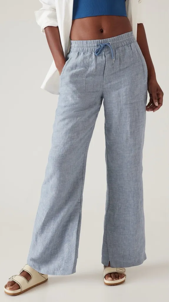 ATHLETA Retreat Linen High Rise Wide Leg Pant in Chambray Blue Size 12 High rise. Wide leg. Pull o... Show more