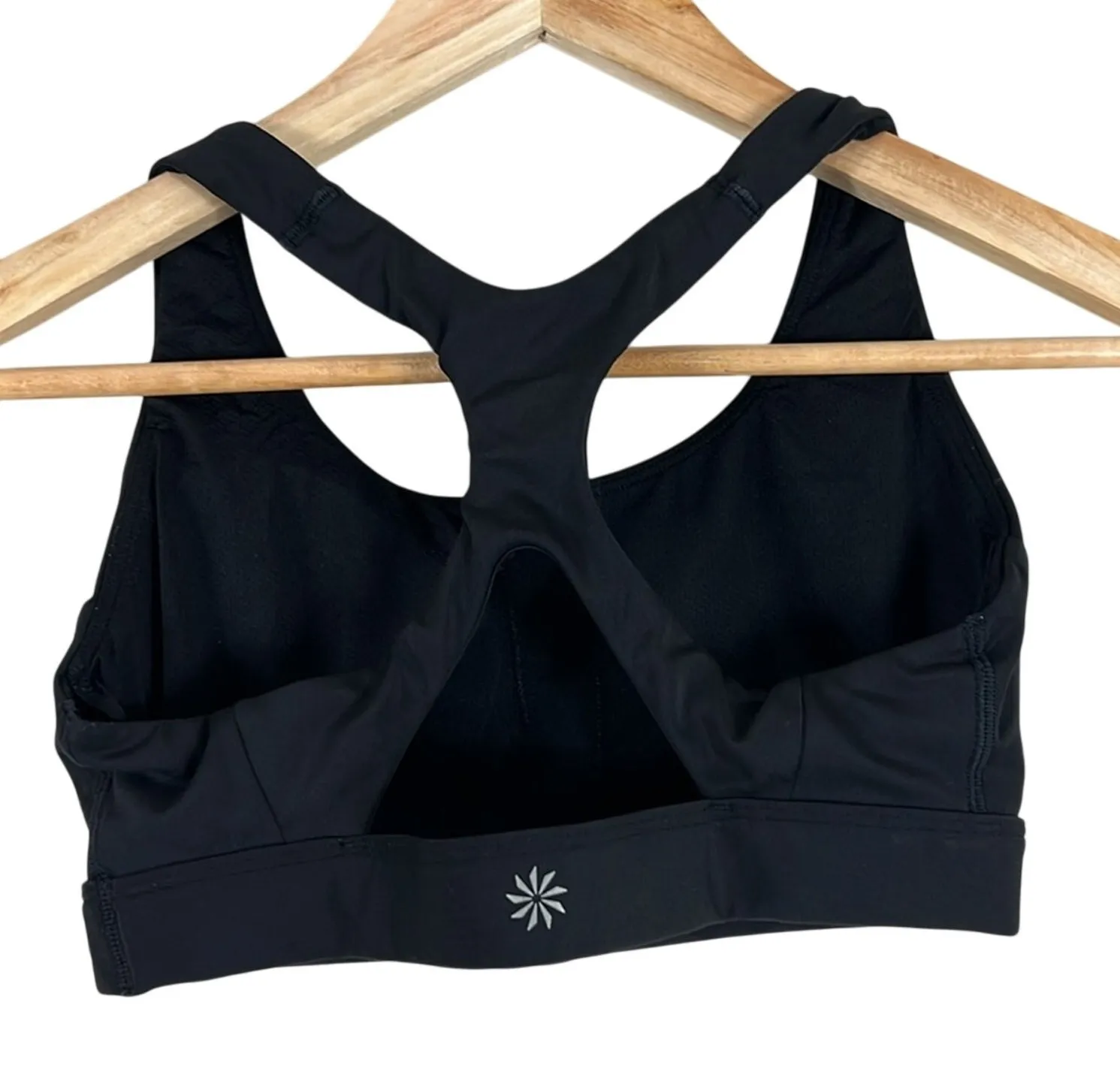 Sleek black sports bra with a racerback design Triangle cut out Features moisture-wicking fabric and... Show more